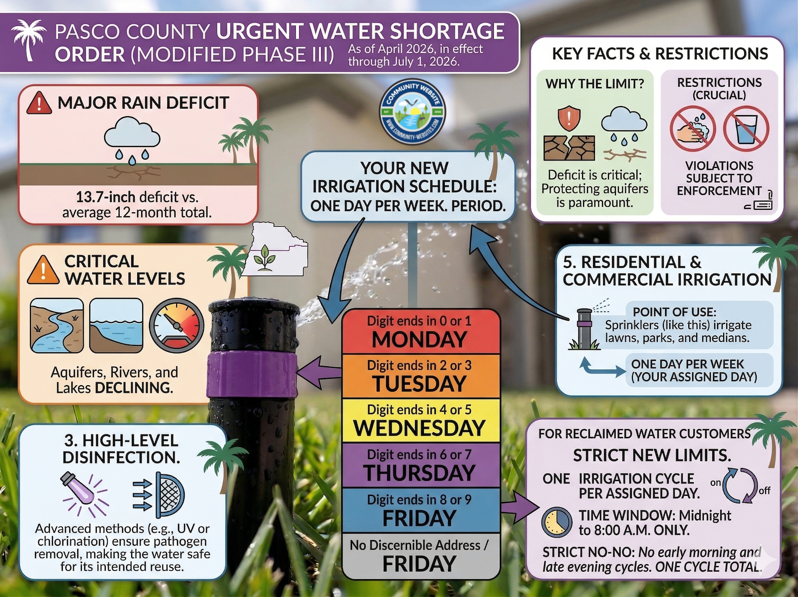 Information in this article reflects the Modified Phase III Water Shortage Order in effect through July 1, 2026. Restrictions may be updated based on regional rainfall and water supply conditions. Always check the Pasco County Utilities website for the most current schedule.