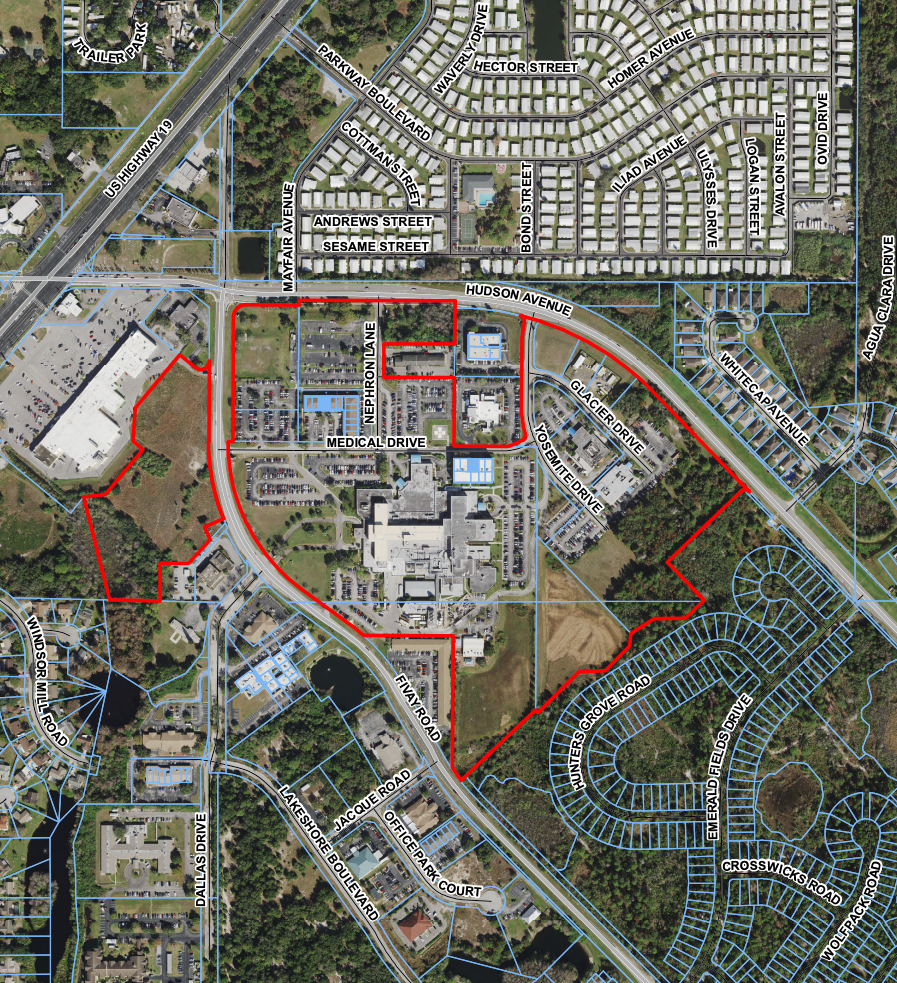 During a public hearing on Feb. 20, the Pasco County Planning Commission considered proposals for the development, which would include 600,000 square feet of hospital space, 200,000 square feet of medical offices, and 50,000 square feet of retail facilities. The proposed expansion would span 62.98 acres on both sides of Fivay Road, near the intersection of Hudson Avenue.
